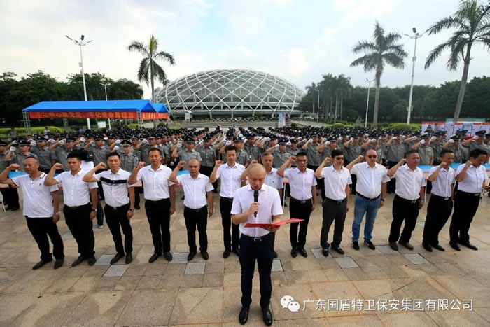國盾特衛保安集團與全市保安代表一起莊嚴宣誓:“對黨忠誠、服務人民、履職盡責,不忘初心、牢記使命,以高標準、必勝信心、全力以赴、頑強拼搏,為新中國成立70周年安保任務,努力奮斗!” ——宣誓人:廣東國盾特衛保安集團有限公司全體保安員。