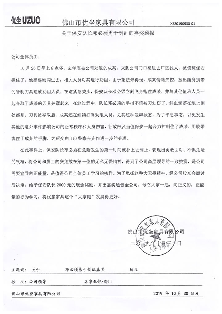 在此事件上,保安隊長鄧必須在危險發生的第--時間就撲上去制止,表現出勇敢面對、不懼危險 的氣概,將公司和員工的安危放在第一位的無私無畏精神,得到了公司高層領導的-致贊賞,是公司 需要宣導的正能量,是值得公司全體員工學習的榜樣。為了弘揚這種大無畏精神,經公司股東會商討 后決定,給予保安隊長2000元的現金獎勵,并出嘉獎通告全公司。號召大家一起,向正義的,正能 量的行為學習,將優坐家具這個“大家庭”發展得更好。