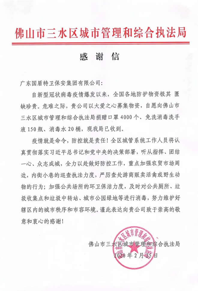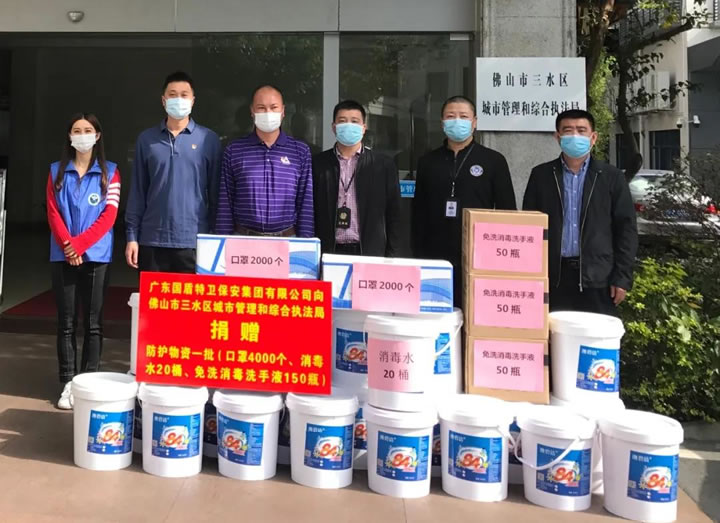 —、廣東國盾特衛(wèi)保安集團(tuán)有限公司 向三水區(qū)城市管理和綜合執(zhí)法局捐贈一批防護(hù)物資