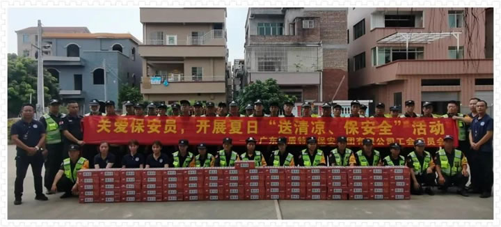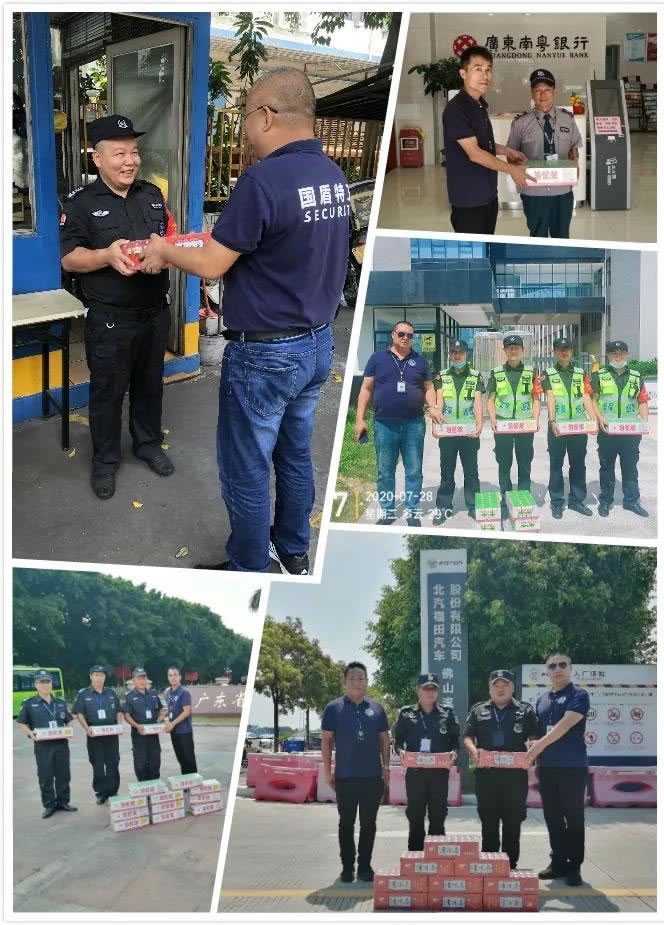 炎炎盛夏,高溫酷暑,國盾特衛保安員頭頂驕陽、不畏酷暑、堅守崗位,堅持以高質量、高標準的工作態度完成各項安保工作。為保障一線保安員的身心健康,切實做好夏季防暑降溫工作,廣東國盾特衛保安集團有限公司工會委員會組織服務管理部各級干部關心關愛保安員,開展夏日“送清涼、保安全”活動,確保一線基層保安員安全度夏,為堅守在高溫下一線工作的保安員送去了清涼和公司的關懷。