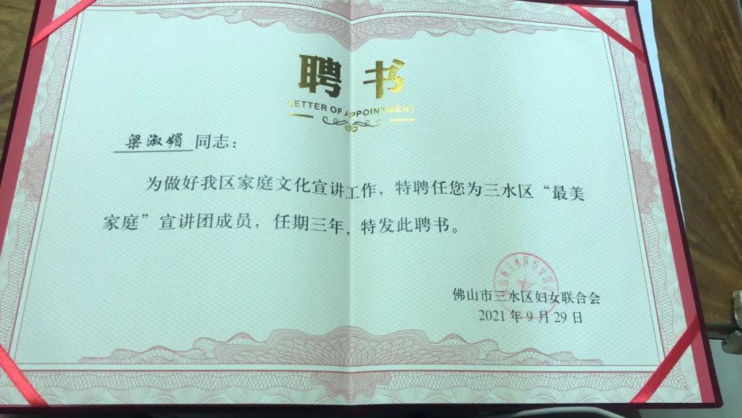 祝賀國盾特衛集團保安服務公司婦聯副主席梁淑媚同志被聘為“最美家庭”宣講團成員