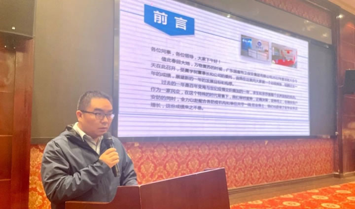 大會在莊嚴的國歌聲中拉開序幕,會上集團公司副總經理王延周同志作《國盾特衛保安集團2022年度工作總結》,圍繞重點項目和任務、工作亮點等方面總結成績及經驗,正視差距、補齊短板,并對2023年重點工作的規劃部署進行了匯報。他表示,2023年,要帶領各部門以堅如磐石的信心、堅韌不拔的毅力奮力推進國盾特衛安保事業更上一層樓。