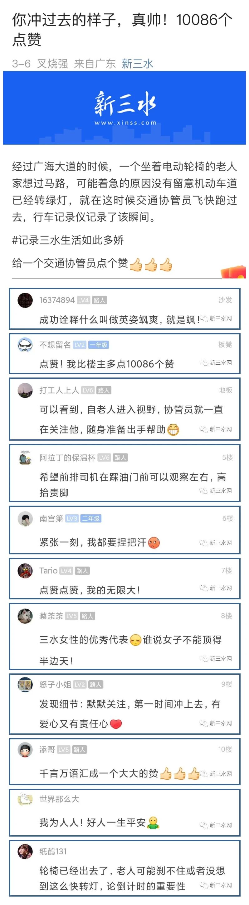3月6日早高峰時段,在三水城區廣海大道與健力寶平交路口,發生驚險一幕:一名坐著電動輪椅的老人正準備過馬路,卻絲毫沒有留意對面的綠燈已轉紅燈,緩緩地向著不斷有車輛駛過的人行道行進……關鍵時刻,我司派駐的一名交通協管員一個箭步沖上去,快速扶上并剎住了老人家的電動輪椅,及時化險為夷。這一幕被路人的行車記錄儀記錄下來,并以《你沖過去的樣子真帥!10086個點贊》為題在網上發表了帖子,產生了積極的社會反響,獲廣大網友跟帖點贊!