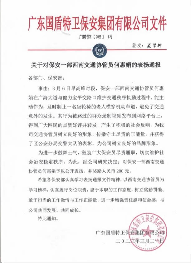 我司協管員何惠娟為西南交通協管員樹立了良好形象,傳播了守土盡責的正能量,并獲得了區公安分局交通警察大隊致函表彰。集團公司黨支部書記、董事長夏學樹獲悉后,高度贊揚了西南交通協管員在維護道路交通秩序中盡責履職,能急群眾之所急,解群眾之所憂,全力為群眾排憂解難,用實際行動踐行了黨的群眾路線,認真貫徹落實“我為群眾辦實事”的舉措,同時要求總經辦將其事跡形成表彰通報至集團公司各工作群,并指示集團公司黨支部副書記、工會主席、董事長助理鄭紅戰連同總經辦到西南交通協管駐點辦公室送去表彰獎勵,號召全體員工以此作為學習榜樣,樹立“真誠、文明、安全、發展”的服務理念,進一步增強保安從業人員的職業認同感、自豪感。